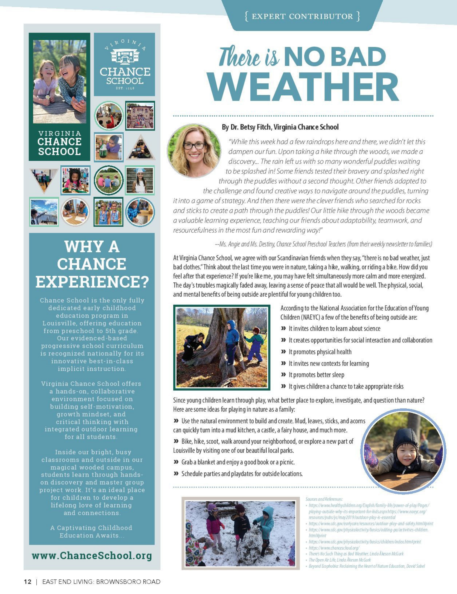 At Virgina Chance School, we agree with our Scandinavian friends when they say, “there is no bad weather, just bad clothes.” Think about the last time you were in nature, taking a hike, walking, or riding a bike. How did you feel after that experience? If you’re like me, you may have felt simultaneously more calm and more energized. The day's troubles magically faded away, leaving a sense of peace that all would be well. The physical, social, and mental benefits of being outside are plentiful for young children too.